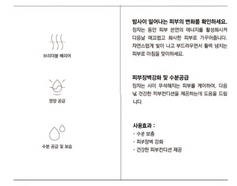 - 닐리덴다이플루오라이드코폴리머: 피부의 자연 수분을 유지하고 밤사이 지속적인 기능을 돕습니다.