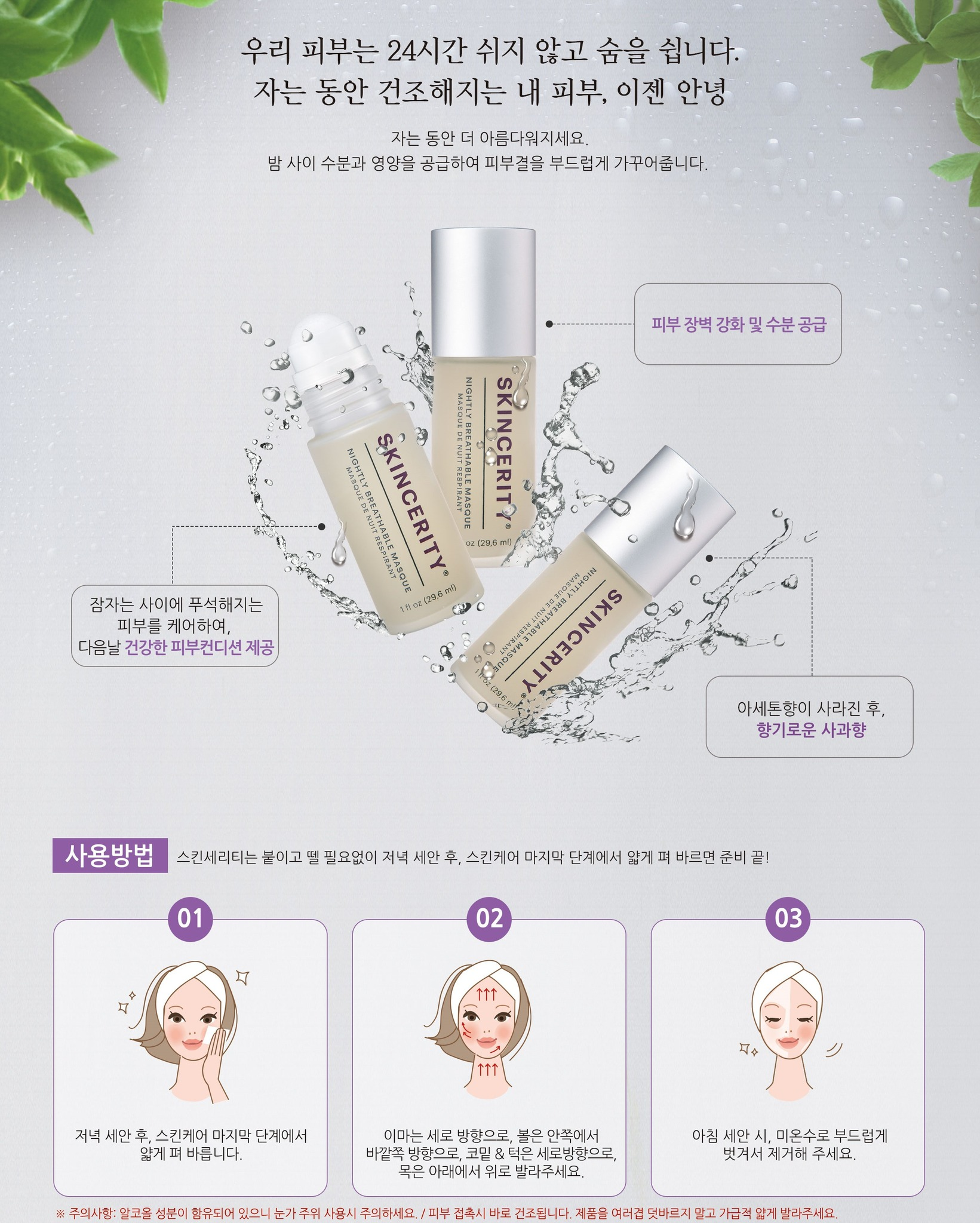 스킨세리티(Skincerity)는 자는 동안 밤사이 수분과 영양을 공급하여 피부결을 부드럽게 가꾸어 줍니다.